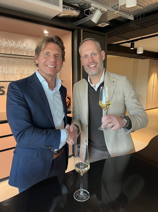 Daniel van der Pluijm van Nobel Capital Partners brengt samen met Hugo Eijkelkamp (rechts) een toost uit op de samenwerking.