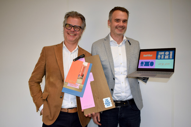 Directeur Jeroen de Zwart (links) met marketing manager Joost Heijnen, beiden poserend met materialen en de huisstijl van Saffier.