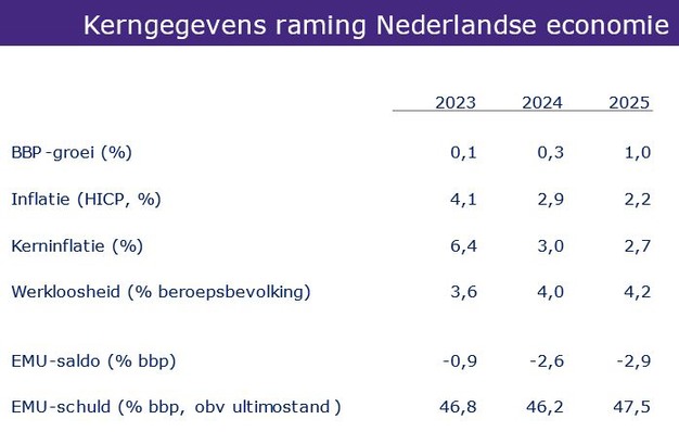 De inflatie daalt iets sneller dan we afgelopen juni raamden. Dat komt vooral door de lagere energieprijzen. Daarnaast koelt de economie af, door het monetaire beleid van de Europese Centrale Bank en door de terugval van de wereldhandel. De economische groei is dit jaar fors lager dan vorig jaar toen er nog sprake was van inhaalgroei na de pandemie. Het bruto binnenlands product (bbp) stijgt met 0,1%, gevolgd door 0,3% en 1,0% in de komende jaren.