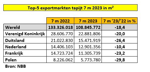 Het Verenigd Koninkrijk blijft de belangrijkste exportmarkt met een aandeel van 21% in m². De export naar het VK daalde met 20%.