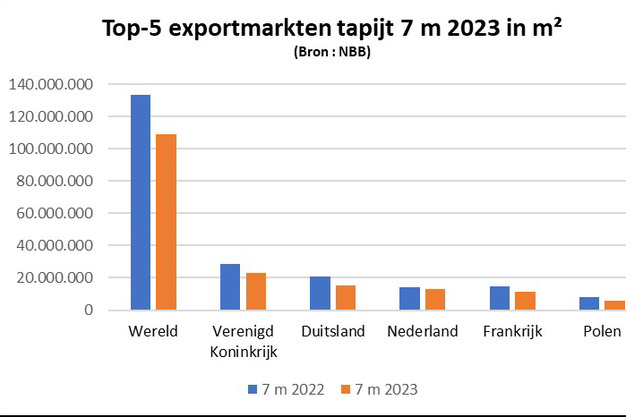 Tijdens de eerste 7 maanden 2023 viel de Belgische tapijtuitvoer wereldwijd terug met 16,9% in waarde en met 18,4% in volume (m²).