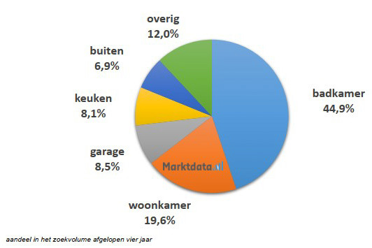 Circa 45 procent van het zoekvolume met aanduiding van een soort ruimte heeft betrekking op de badkamer. Op de tweede plaats staat de woonkamer met een aandeel van 19,6 procent in het zoekvolume. De nummer drie is de garage, welke 8,5 procent van het zoekvolume vertegenwoordigt. Momenteel zien we met name bij de keuken en slaapkamer een sterke nominale daling van het voortschrijdende jaarlijkse zoekvolume. Het zoekvolume van de garage, buiten en het terras ontwikkelt zich sterk positief.