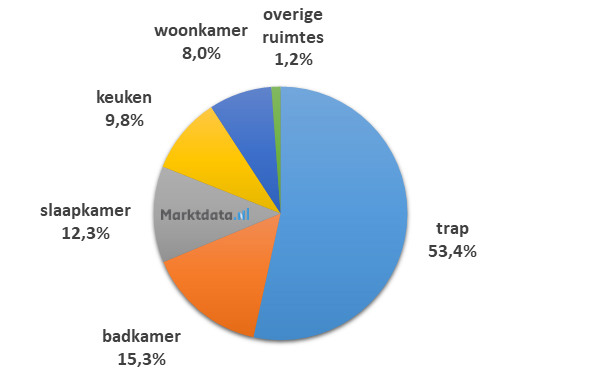 Ruim de helft van het zoekvolume met type ruimte aanduiding heeft betrekking op de trap. Op de tweede plaats staat de badkamer met een aandeel van 15,3 procent in het zoekvolume. De nummer drie is de slaapkamer, die 12,3 procent van het zoekvolume vertegenwoordigt.