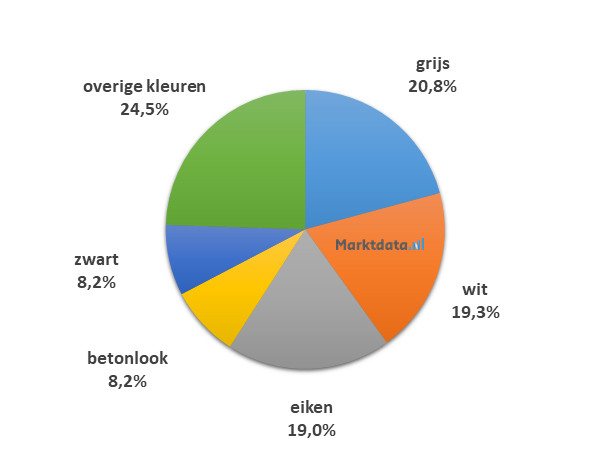 Ruim 20 procent van het zoekvolume met kleur-aanduiding heeft betrekking op grijs. Op de tweede plaats staat wit met een aandeel van 19,3 procent in het zoekvolume. De nummer drie is eiken, welke 19,0 procent van het zoekvolume vertegenwoordigt.