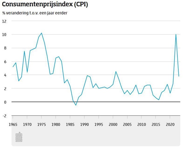 Prijzen van consumentengoederen- en diensten waren in 2023 gemiddeld 3,8 procent hoger dan in 2022, maakt het CBS bekend. In 2022 was de inflatie 10,0 procent. Vooral de prijsontwikkelingen van voeding en energie hadden invloed op de inflatie in 2023. De inflatie zonder energie en motorbrandstoffen kwam in 2023 gemiddeld uit op 6,5 procent.