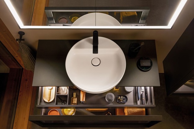 De badkamerserie Qatego van Studio F.A. Porsche richt zich op de harmonieuze spanning tussen geometrisch vormgegeven meubels en afgeronde sanitair objecten. Passend bij het witte keramiek is het badkamermeubel verkrijgbaar in acht kleuren, variërend van glanzend wit tot naturel, ingetogen nuances zoals taupe mat en basalt mat tot krachtige tinten zoals grafietmat. Bovendien ronden houttinten het natuurlijke kleurenspectrum van Qatego af. Bovendien maken verlichte, open vakken de strakke geometrie van het meubilair los en brengen gezelligheid en transparantie in de badkamer. Favoriete producten of decoratieve schalen en vazen vinden hier hun plaats en worden effectief tentoongesteld.