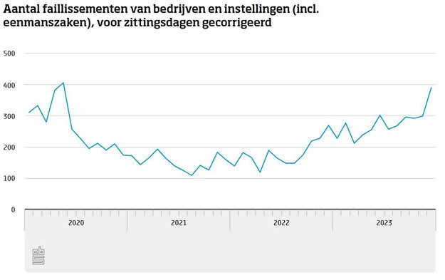In december zijn, voor zittingsdagen gecorrigeerd, 91 meer bedrijven failliet verklaard dan in november, meldt het CBS. Dat is een stijging van 30 procent. De trend van het aantal faillissementen is meer dan een jaar stijgend. Met het decembercijfer is ook het cijfer voor hele jaar bekend. In 2023 zijn volgens voorlopige cijfers 3.271 bedrijven failliet verklaard. Dat is ruim 50 procent meer dan in 2022.