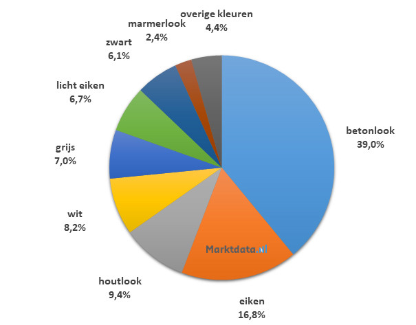 39 Procent van het zoekvolume met kleur-aanduiding heeft betrekking op betonlook. Op de tweede plaats staat eiken met een aandeel van 16,8 procent in het zoekvolume. De nummer drie is houtlook, welke 9,4 procent van het zoekvolume vertegenwoordigt.