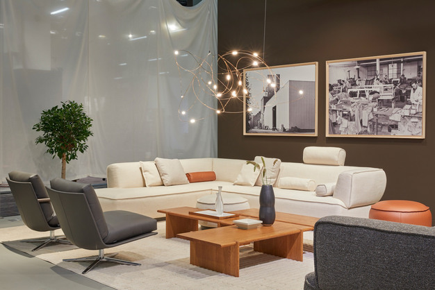 In de beurstand van Leolux had de Loya-collectie een voorname plek gekregen, zoals op bovenstaande foto is te zien. Wat direct opvalt bij dit model zijn de overstekende arm- en rugleuningen. Doordat ze licht gekanteld zijn, vormen ze een open uitnodiging om plaats te nemen. Over het hele ontwerp loopt een lekker uitgesproken bies. "Een royale zadelsteek", omschrijft Antal Németh het treffend, "aangebracht door de alleskunners in het Leolux-atelier. De bies creëert een mooie lijnvoering en is bovendien zodanig geplaatst dat je ‘m niet voelt als je geniet van je welverdiende ontspanning op de bank. Loya legt contact met de grond via een gestoffeerd platform. Dit is net wat verder teruggeplaatst dan de zitting en uitvoerbaar in een afwijkend materiaal ten opzichte van de rest van de bank. Zo geef je Loya een heel eigen twist."