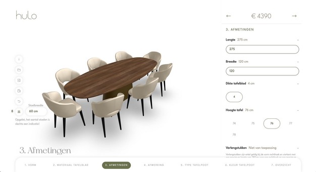 De nieuwe website en online configurator werden mogelijk gemaakt door 3D Config, een onderdeel van het Antwerpse bedrijf Flux. De 3D configurator maakt het mogelijk voor klanten om zelf online een tafel samen te stellen. En hierin kunnen ze ver gaan: naast het materiaal, de kleur, het soort poten, en de afwerking, kunnen ze ook de afmetingen volledig configureren. Alles wordt netjes getoond met of zonder stoelen, zodat iedereen zich perfect kan inbeelden hoe groot het ontwerp nu juist zal uitvallen.