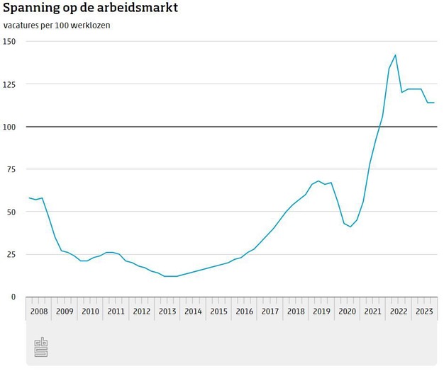 Met een daling van zowel het aantal werklozen (-6 duizend) als het aantal vacatures (-5 duizend) bleef de arbeidsmarkt in het vierde kwartaal van 2023 net zo gespannen als in het derde kwartaal. Tegenover elke 100 werklozen stonden opnieuw 114 vacatures. Het aantal banen blijft groeien. In het vierde kwartaal kwamen er 45 duizend bij. Het aandeel werkenden binnen de bevolking van 15 tot 75 jaar is verder toegenomen tot 73,2 procent. Dat blijkt uit nieuwe cijfers van het CBS.