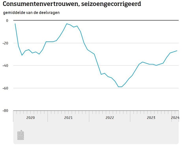 De stemming onder consumenten verbeterde ook in februari weer iets, meldt het CBS. Het consumentenvertrouwen steeg van -28 in januari naar -27 in februari. De koopbereidheid verbeterde, terwijl het oordeel over het economische klimaat wat verslechterde.