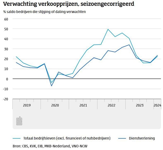 Bij het begin van de coronacrisis verwachtten meer ondernemers een daling van hun verkoopprijzen dan een stijging; daarmee waren de verwachtingen per saldo negatief. Begin 2021 liepen de prijsverwachtingen – voordat de inflatie steeg – sterk op. Deze piekten vervolgens gedurende 2022 met een saldo van bijna 50 procent. Vanaf 2023 daalde het saldo, tot 16 procent aan het eind van dat jaar. Begin 2024 verwachten weer meer ondernemers hogere verkoopprijzen. Waar de prijsverwachtingen in 2021 met name opliepen in de industrie, de bouw en later de detailhandel, is dat nu juist vooral in de dienstverlening en wederom de bouw.