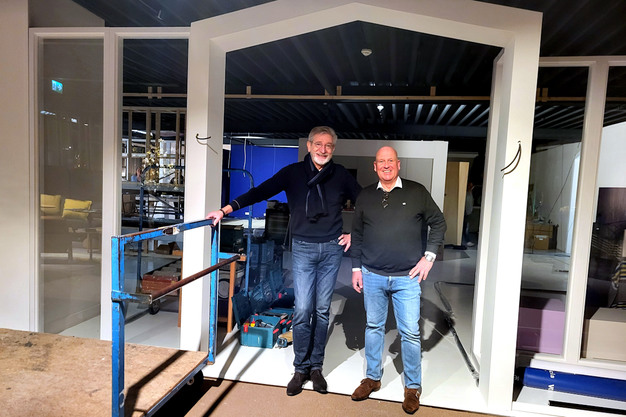 Joris de Raadt (links) met Len de Koster voor de in aanbouw zijnde stand van Designlinq.
