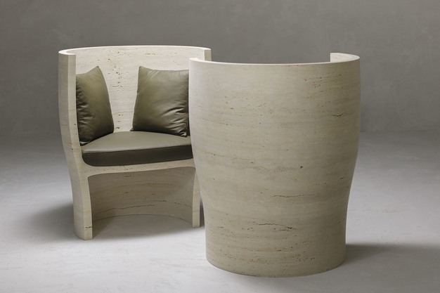 Een opvallend voorbeeld van deze samenwerking is de Holly armstoel, waarbij de golvende schaal is vervaardigd uit Navona Travertijn en wordt omlijst door bekleding van halfnerf rundleer. Het leer, afkomstig uit Gruppo Mastrotto's Linea-assortiment, staat bekend om zijn zachte en semi-matte uitstraling, waardoor het een luxe element toevoegt aan het ontwerp.