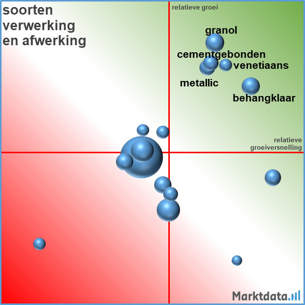 Naast deze algemene ontwikkelingen en trends heeft Marktdata.nl ook big data geanalyseerd op het gebied van marktontwikkelingen voor specifieke soorten verwerking en afwerking van stucwerk. Uit deze big data analyse blijkt dat granol, cementgebonden, Venetiaans, metallic en behangklaar stucwerk ten opzichte van de vele andere soorten verwerking en afwerking een relatief gunstige positie innemen qua verwachte marktontwikkeling voor het komende jaar. Deze soorten stucwerk en afwerking kennen de sterkste relatieve groei van het online zoekvolume en de sterkste relatieve groeiversnelling. Voor grof stucwerk is de situatie tamelijk ongunstig; dit soort kent de laagste relatieve groei en ook een lage relatieve groeiversnelling ten opzichte van de andere soorten verwerking en afwerking.