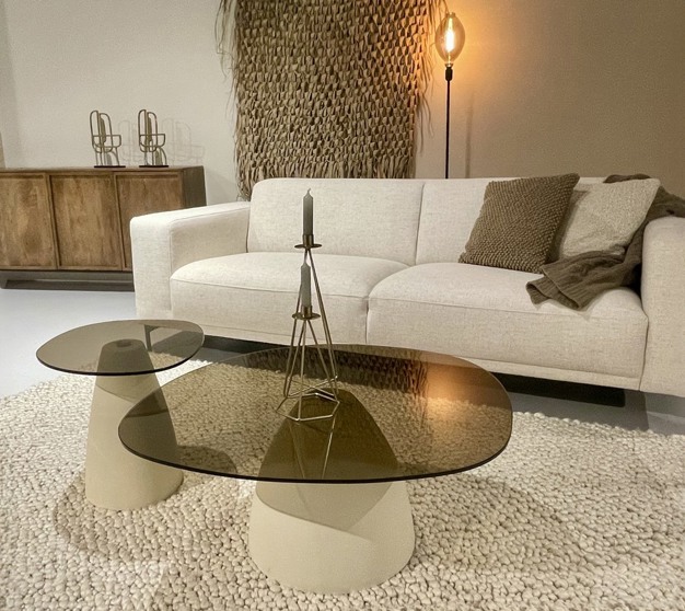 Nieuwe salontafels, bestaande uit glas en betoncire.