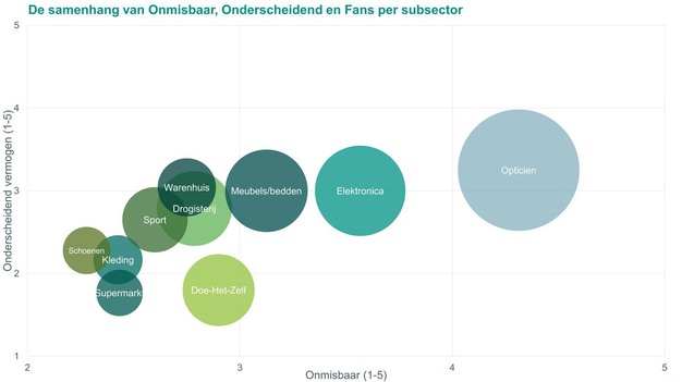 Omvang bollen weerspiegelen de mate waarin de respondenten fan zijn van de retailmerken in de desbetreffende subsector op een schaal van 1-5. Bron: Retail Ranking 2023, Q&A Retail.