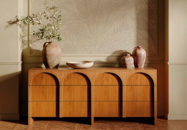 "Semiramis is een onderdeel van Casadeco's collectie 'Babylone'. Het ontwerp heeft een ongelooflijke geschuurde look. De waaiervormige bladeren van het Semiramis-patroon lijken alsof ze op de muur getekend zijn, waardoor een hypnotiserende weergave ontstaat. Hun spectaculaire afwerking is een combinatie van 3D-effecten en hun XXL-formaat."