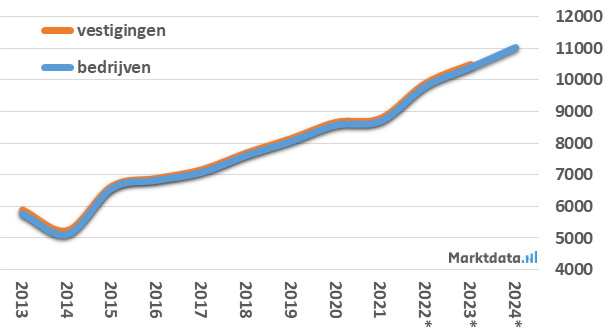 Interieurstylisten met meerdere bedrijfsvestigingen komen nauwelijks voor. Ten opzichte van het jaar 2014 is het aantal interieurstylisten nu ruim verdubbeld. In de afgelopen twee jaar laten zowel het aantal bedrijven als het aantal vestigingen een jaarlijkse groei zien van circa zes procent. Over de afgelopen tien jaar zien we een vrij constante groei van het aantal interieurstylisten. Alleen in het eerste corona-jaar stagneerde de groei tijdelijk.