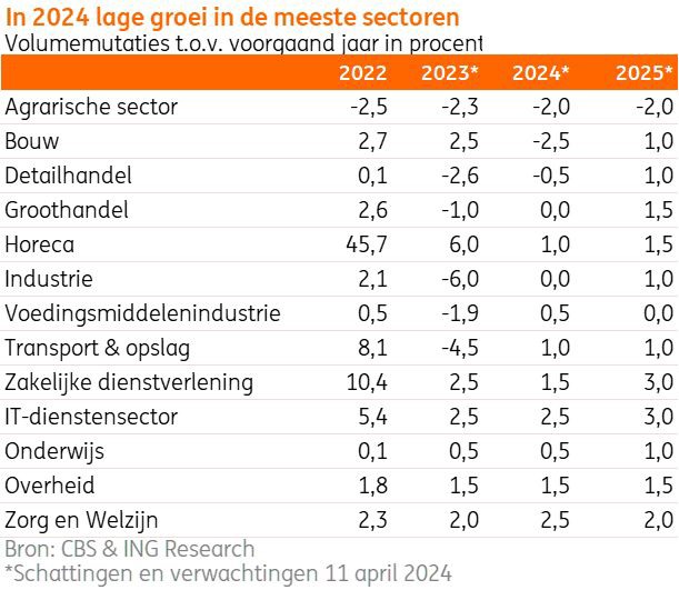 Voor 2024 verwacht ING Research voor de meeste bedrijfssectoren een lichte groei. Verdere digitalisering en de uitrol van generatieve AI zorgen voor aanhoudende groei in de IT-sector waardoor ook de groei in 2025 hoog blijft, van 2,5 naar zelfs 3%. Voor de horeca is de verwachting dat de volumes dit jaar beperkt toenemen. Hogere personeelskosten maken prijsverhogingen in cafés en restaurants noodzakelijk. De bouw laat dit jaar de grootste krimp zien, voornamelijk doordat er fors minder bouwvergunningen zijn afgegeven en er minder nieuwbouw is verkocht. Positief is dat de industriële productie de bodem lijkt te hebben bereikt. Deelreeksen van de inkoopmanagersindex voor nieuwe orders en gerealiseerde productie wijzen voor het eerst in meer dan een jaar tijd weer op aantrekkende activiteit.