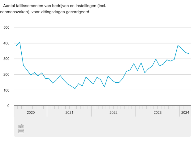 In maart zijn, voor zittingsdagen gecorrigeerd, 8 bedrijven minder failliet verklaard dan in februari, meldt het CBS. Dat is een daling van 2 procent. De onderliggende trend van het aantal faillissementen is echter bijna 2 jaar stijgend. In de eerste drie maanden van 2024 zijn ruim 46 procent meer bedrijven failliet verklaard dan in dezelfde periode een jaar eerder.
