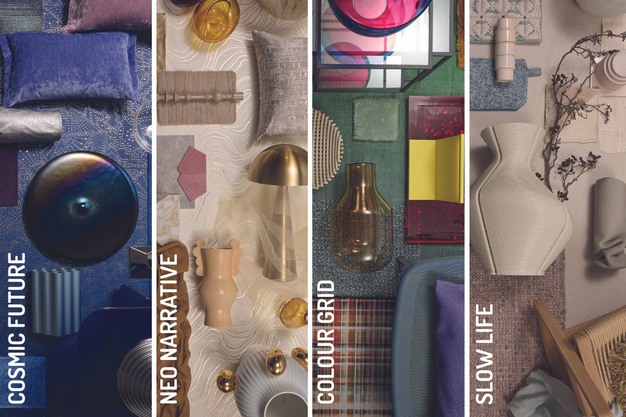 De verschillende crises vliegen ons naar de keel. Deze beklemmende toestand willen we ontvluchten en vermijden. Onder invloed van deze tendens ontstaat een stijltrend waar bij decadentie en luxe belangrijke sleutelwoorden zijn. Rijke materialen met warme kleuren die aan eten of aan kostbaarheden doen denken zoals room, karamel, chocola, amber, amethist en bloedkoraal zetten de toon. De Neo Narrative moodboard visualiseert deze trend.