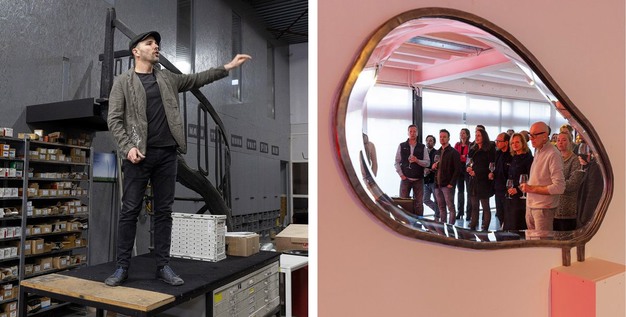 De respectievelijke gasten van Lensvelt en Maarten Baas werden ontvangen met een drankje in het atelier, gevolgd door een boeiende rondleiding door Maarten Baas in zijn studio. Hier gaf Baas inzicht in zijn werk en vertelde hij over zijn schitterende, sprankelende stuk 'Less Less Less' (Milan Design Week 2023) en de nieuwe 'Off Balance' spiegel, maar ook over zijn beroemde Real Time Grandfather Clock, die ook is opgenomen in de vaste collectie van het Rijksmuseum. Maarten toonde ook vol vertrouwen nieuwe stukken onder embargo.