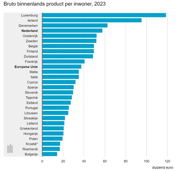 Het Nederlandse bruto binnenlands product (bbp) per inwoner was in 2023 bijna 58 duizend euro. Nederland staat daarmee op de vierde plaats binnen de Europese Unie, net als in 2022. Het bbp per inwoner was net als een jaar eerder anderhalf keer zo groot als het EU-gemiddelde van bijna 38 duizend euro. Dit blijkt uit cijfers van het CBS en Eurostat.