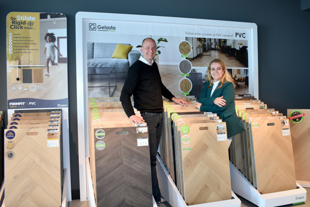 Thijs Borst en Bianca van Dijk bij een nieuwe vloerendisplay. Naast eigen labels is Gelasta dealer van Egger (bekend om de hoge kwaliteit met een eigentijds palet aan houtdecoren, unikleuren en materiaalreproducties) en Firmfit (heeft met 10dB de stilste rigid clickvloeren).
