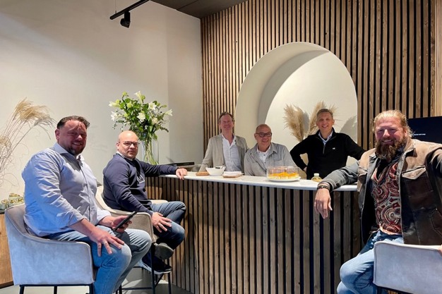 De heren van Van Gils uit Oldenzaal op bezoek (links), met achter de bar Matthijs Bakker, nieuwe accountmanager Hans Kennis, Raymond Klein en Herman van Primavera (rechts).