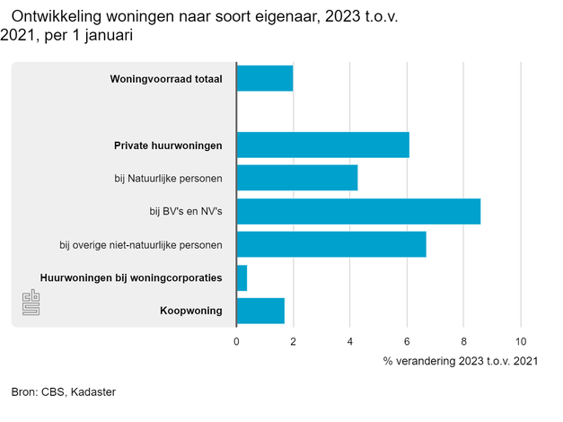 Het aantal private huurwoningen nam van 1 januari 2021 tot 1 januari 2023 met 6,1 procent toe tot bijna 1,2 miljoen. Hiermee groeide het aantal private huurwoningen relatief sterker dan het aantal koopwoningen (1,7 procent) en het aantal corporatiehuurwoningen (0,4 procent).