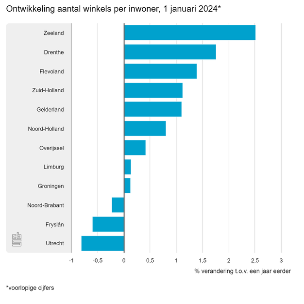 In alle provincies nam het aantal inwoners per 1 januari 2024 toe ten opzichte van een jaar eerder. Het aantal fysieke winkels steeg niet overal even hard mee. In Zeeland, waar de toename van het inwonertal het kleinst was, steeg het aantal winkels per hoofd het hardst (2,5 procent). In Utrecht, Fryslân en Noord-Brabant daalde het aantal te bezoeken winkels per inwoner tussen de -0,2 en -0,9 procent.