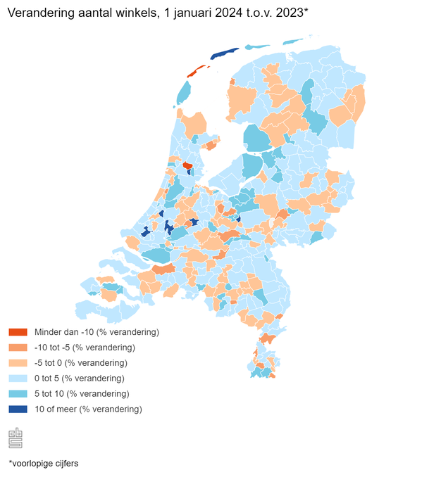 In twee derde van de gemeenten nam het aantal winkels toe. In de gemeente Oostzaan steeg het aantal winkels relatief het sterkst, met 20 procent ten opzichte van 1 januari 2023. Een van de sterkste dalers was buurgemeente Wormerland (-10,3 procent). Op de Waddeneilanden nam het totaal aantal winkels toe met 5,1 procent. Alleen Vlieland steeg niet mee met zijn eilandburen, daar nam het aantal fysieke winkels juist af met 11,1 procent.