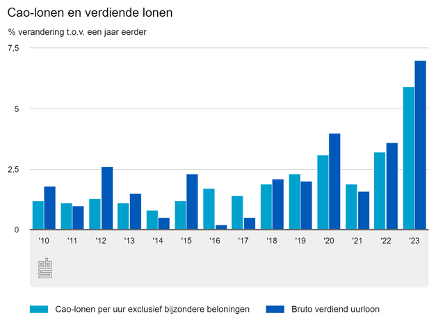 Ook gemeten over een langere periode zijn de verdiende lonen meer toegenomen dan de cao-lonen. Voor de periode 2010-2023 komt de stijging van de verdiende lonen uit op 32,8 procent, terwijl de cao-lonen 30,4 procent toenamen. Ter vergelijking: de inflatie, op basis van de consumentenprijsindex, bedroeg in deze periode 37,7 procent.