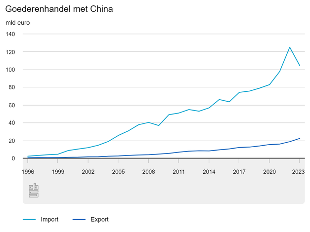 Nederland importeerde in 2023 voor 104,3 miljard euro aan goederen uit China. Dat is 20,8 miljard euro minder dan een jaar eerder. Zowel de handel als de doorvoer zijn afgenomen. Deze ontwikkeling ligt in lijn met de algehele krimp van de Chinese export. Terwijl de import daalde, steeg de export van Nederlandse producten naar China in 2023 met 20 procent. De handelsbalans is daardoor met 24,5 miljard euro minder negatief geworden. Desondanks is de handelsbalans met China nog 81,9 miljard euro negatief.