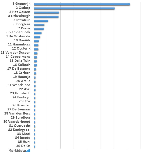 Uit de analyse van de meest voorkomende gerelateerde zoekopdrachten op het gebied van tuincentra blijkt dat er vaak gezocht wordt naar een specifiek tuincentrum of winkelformule. Naar welke specifieke tuincentra en winkelformules wordt er het meest gezocht? Het zoekvolume van de meest voorkomende tuincentra en (online) winkelformules is gemeten over de afgelopen vier jaar. Er is gemeten hoe vaak er naar een specifiek tuincentrum of winkelformule wordt gezocht gerelateerd aan tuincentra. Onderstaand figuur toont de meest gezochte tuincentra en winkelformules met het gemiddeld aantal maandelijkse zoekopdrachten over de afgelopen vier jaar. Het gemiddeld aantal maandelijkse zoekopdrachten van een bepaald tuincentrum of winkelformule is een optelsom van alle verschillende zoekwoordcombinaties waarin het tuincentrum of de winkelformule voorkomt.