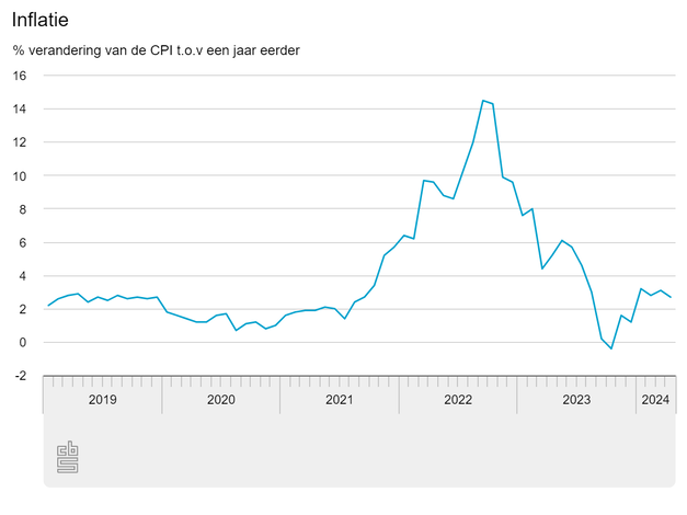 Consumentengoederen en -diensten waren in april 2,7 procent duurder dan in dezelfde maand een jaar eerder, meldt het CBS. In maart was de inflatie 3,1 procent. De inflatie wordt elke maand gemeten als de ontwikkeling van de consumentenprijsindex (CPI) ten opzichte van dezelfde maand in het voorgaande jaar. Het inflatiecijfer van april is hetzelfde als bij de snelle raming die op 30 april is gepubliceerd.