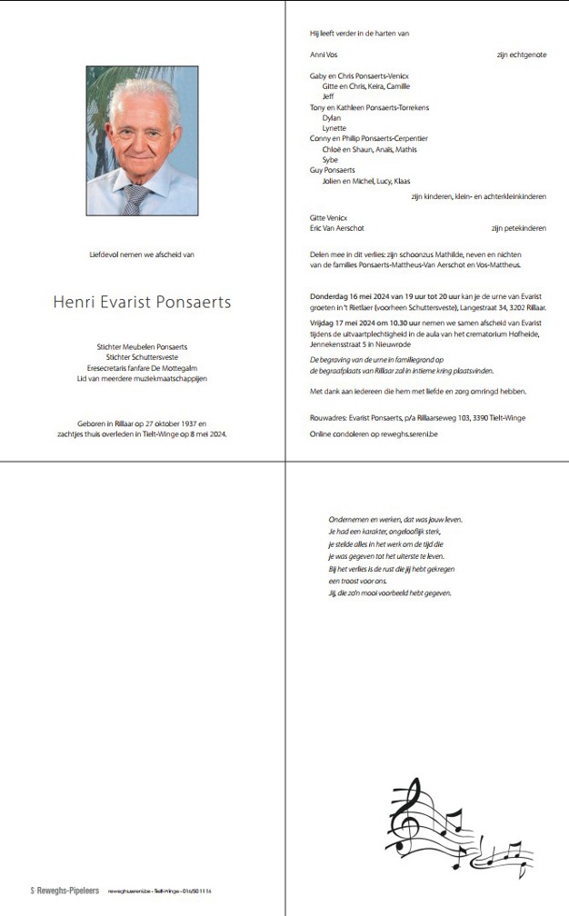 Henri Ponsaerts is overleden. Hij heeft Meubelen Ponsaerts opgericht.
