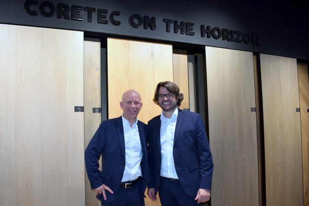 Philiep Caryn met marketing- en productdirector Stijn Windels van COREtec Floors, poserend voor de vernieuwde XL END-collectie.