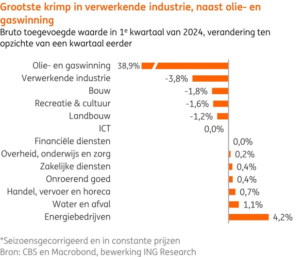 Hoewel de grote industriële krimp een zwakke prestatie van onze economie in het eerste kwartaal was, die ook moeilijk te ontkennen valt, zal deze krimp de komende tijd niet aanhouden. De vooruitkijkende indicatoren voor de verwerkende industrie verbeteren de laatste tijd en wijzen op het terugkeren van groei. De grootste daling van de toegevoegde waarde in het eerste kwartaal deed zich overigens niet voor in de industrie, maar in de delfstoffenwinning. Dit had weinig met de conjunctuur te maken. Het was namelijk het gevolg van de lage vraag naar gas vanwege de hoge temperaturen en de sluiting van het Groningen-gasveld.