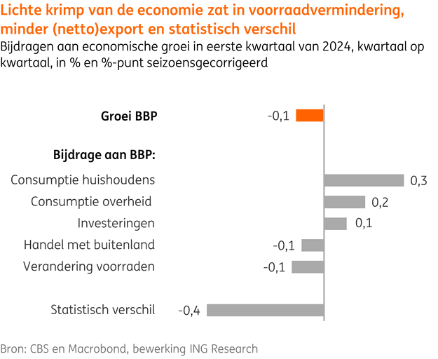Hoewel het bbp-cijfer zwakker uitviel dan verwacht, lijken de onderliggende ontwikkelingen juist beter dan verwacht. Ten eerste was de belangrijkste oorzaak van de afname van het binnenlands product statistisch van aard: macro tellen niet alle cijfers altijd goed bij elkaar op. Dan is er een statistische sluitpost nodig. Deze keer viel die erg negatief uit. Zonder het negatieve effect van de statistische sluitpost van -0,4% bbp zou het economische groeicijfer positief zijn geweest, namelijk +0,3% groei kwartaal-op-kwartaal (gecorrigeerd voor seizoensinvloeden). Mogelijk werkt het CBS dit verschil in cijfers bij latere bijstellingen van de nationale rekeningen nog weg, wat best zou kunnen leiden tot een opwaartse herziening van het bbp-groeicijfer.