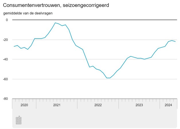 Het vertrouwen van consumenten daalde in mei een fractie, meldt het CBS. Het consumentenvertrouwen nam af van -21 in april naar -22 in mei. Het oordeel over het economische klimaat was negatiever, maar de koopbereidheid was iets minder negatief. De kleine daling in mei volgt op acht maanden waarin het consumentenvertrouwen verbeterde.