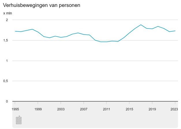 In 2023 verhuisden 1,73 miljoen inwoners van Nederland, 1,6 procent meer dan in 2022. Daarmee lijkt de dalende trend die werd ingezet na 2017 wat te stabiliseren. Vooral jongeren van 17 tot 22 verhuisden meer. Dat meldt het CBS op basis van nieuwe cijfers. Ondanks de toename in 2023 verhuisden relatief weinig mensen vergeleken met topjaar 2017. In dat jaar wisselden 1,88 miljoen mensen van woning. Van 2009 tot en met 2013 verhuisden de minste mensen: minder dan 1,5 miljoen per jaar.