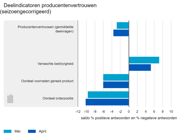 De producenten in de industrie waren in mei minder negatief dan in april. Het vertrouwen ging van -3,6 in april naar -2,8 in mei, aldus het CBS. Fabrikanten waren vooral positiever over de verwachte bedrijvigheid. Het producentenvertrouwen lag in mei onder het gemiddelde van de afgelopen 20 jaar van -1,3. Het vertrouwen bereikte in oktober 2021 de hoogste waarde (10,4). In april 2020 werd de laagste waarde (-31,5) genoteerd.