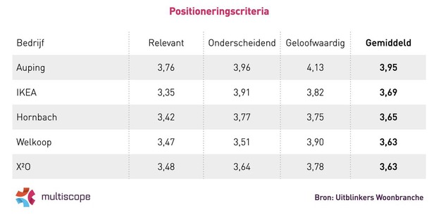 Een goede positionering moet voor de consument relevant, onderscheidend en geloofwaardig overkomen. Consumenten beoordeelden de partijen op een schaal van 1 tot en met 5 op deze criteria. Auping heeft volgens de klant de beste positionering (3,95). Vooral op 'geloofwaardigheid' scoort Auping hoog (4,13). IKEA volgt op de tweede plek (3,69) en Hornbach op de derde plek (3,65). Welkoop (3,63) en X²O (3,63) maken de top vijf compleet. Auping scoort ook hoog op andere prestatie-indicatoren zoals op de waardestrategie 'beste product' en 'beste service'. Daarmee is Auping een van de vijf supersterren in de woonbranche.