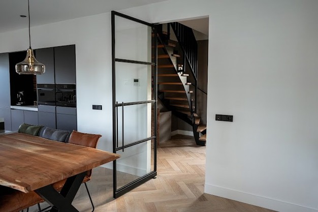 Staal biedt veel afwerkingsmogelijkheden. Je kunt kiezen voor een gepoedercoate afwerking in bijna elke kleur, wat je trap een duurzame en stijlvolle uitstraling geeft. Denk ook aan het toevoegen van houten treden of glazen elementen voor een mix van materialen die zowel modern als warm aanvoelen. Verder kun je stalen trappen mooi combineren met stalen deuren, voor een strak en modern interieur.