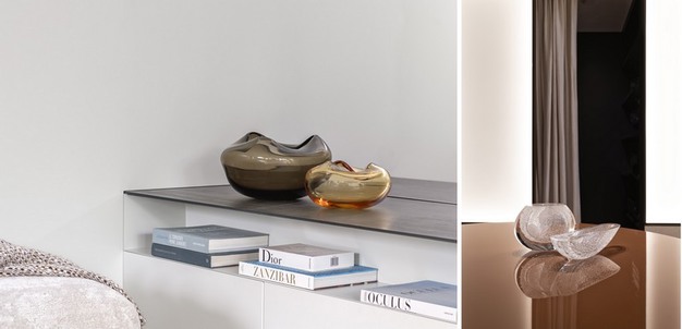 De laatste nieuwe designs van de studio Cá D'Oro uit Poços de Caldas, Minas Gerais, Brazilië: Ocean vase large fumê & Vase ocean ambar en rechts Vase 92 transparent bubbles & Vase canoe 160 transparent bubbles. De Italiaanse Seguso-familie is een van de meest gewaardeerde, historische en gerespecteerde families van glasblazers afkomstig van het eiland Murano bij Venetië. Hun geschiedenis gaat terug tot in 1292!