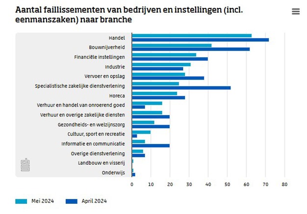 In mei zijn, voor zittingsdagen gecorrigeerd, 18 minder bedrijven failliet verklaard dan in april, meldt het CBS. Dat is een daling van 5 procent. De onderliggende trend van het aantal faillissementen is echter ruim 2 jaar stijgend. In de eerste vijf maanden van 2024 zijn er ruim 40 procent meer bedrijven failliet verklaard dan in dezelfde periode een jaar eerder.