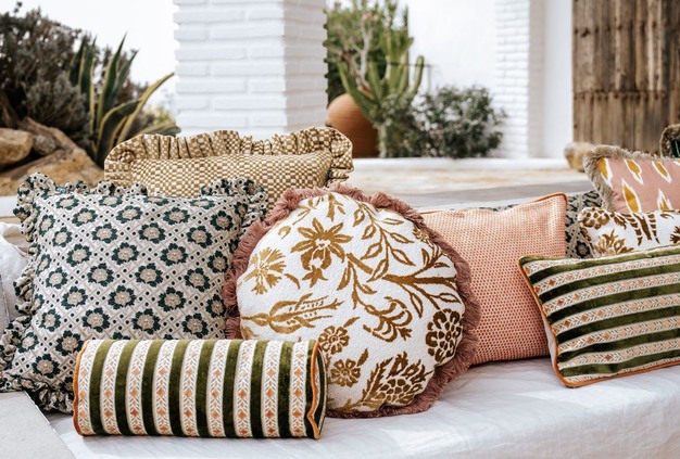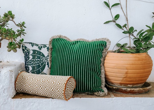 De uit Spanje afkomstige stoffen hebben een rijkelijke uitstraling en de eigentijdse kleuren zorgen een beetje zuidelijke pit in je interieur. Denise van den Berg, eigenaresse van DAY: "Een interieur wordt pas spannend als er een pepertje wordt toegevoegd, bijvoorbeeld door uitgesproken kleur of een combinatie van verschillende stoffen die je misschien niet bij elkaar verwacht. Hierdoor krijgt je interieur meer eigenheid." De kussens zijn met de hand vervaardigd in een Haarlems atelier, en dat zie je terug in de hoogwaardige kwaliteit van de details zoals plooibiezen en franjes. Met de kussencollectie zet DAY Interieurontwerp een eerste stap in het creƫren van een eigen productlijn.